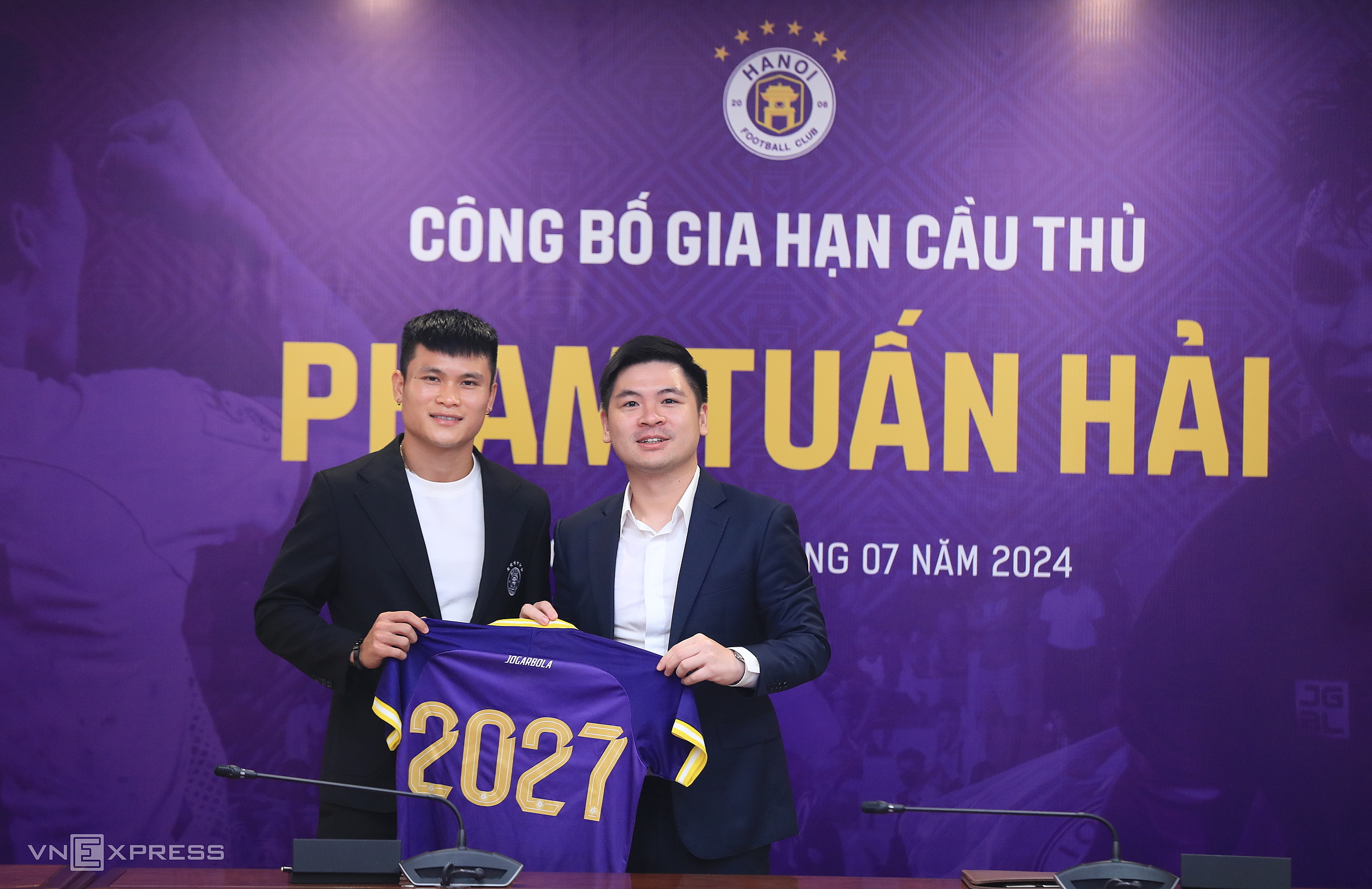 Tiền đạo Phạm Tuấn Hải (trái) và chủ tịch Hà Nội FC Đỗ Vinh Quang ở buổi gia hạn sáng 1/7. Ảnh: Minh Minh