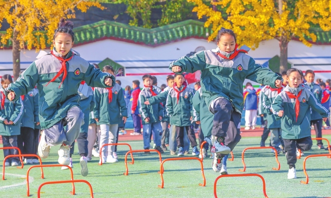 Học sinh một trường tiểu học ở Hồ Bắc,miền trung Trung Quốc,thi vượt chướng ngại vật,hôm 2/12/2024. Ảnh: VCG
