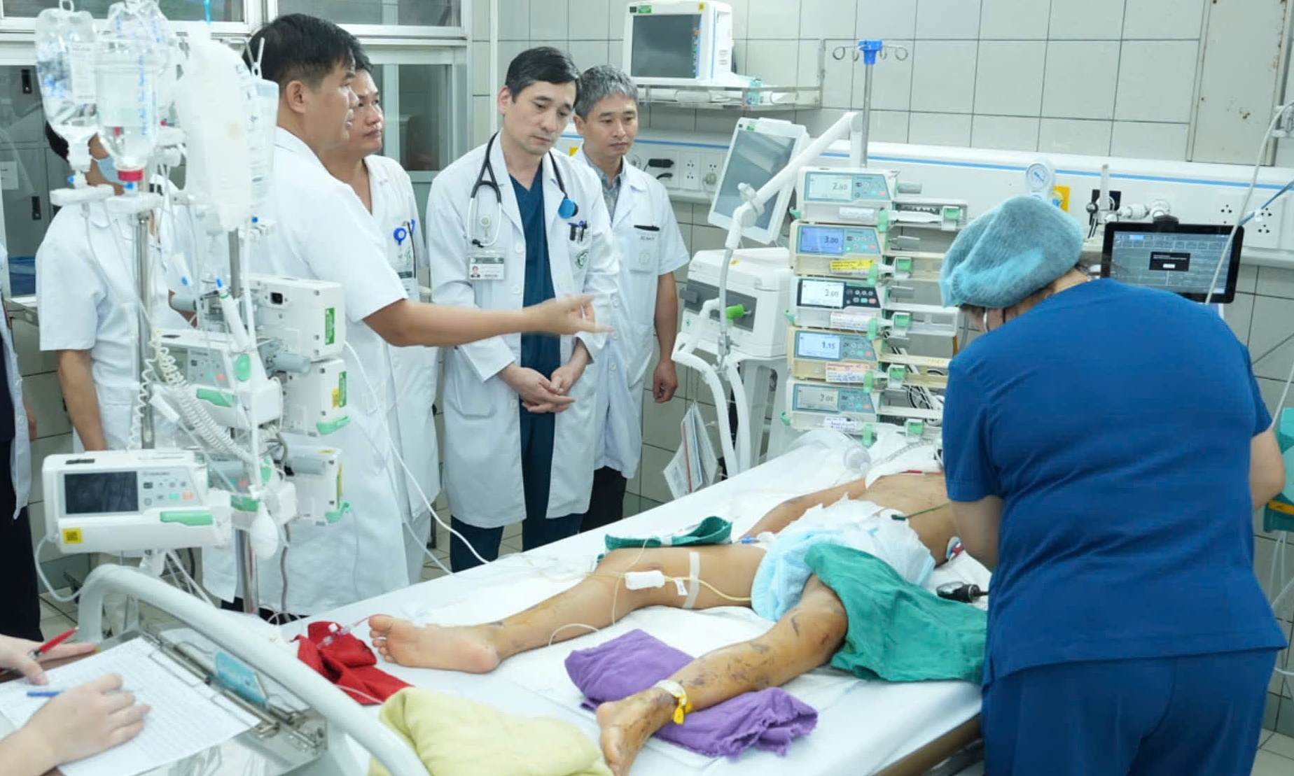 Các bác sĩ hội chẩn,xác định bé bị viêm phổi do đuối nước và hít bùn đất biến chứng suy hô hấp tiến triển (ARDS). Trẻ còn đa chấn thương,gãy xương đòn phải,đụng dập gan phải,sốc nhiễm khuẩn suy đa tạng,rối loạn đông máu... Hiện,bé được điều trị tích cực tại Trung tâm Nhi khoa,Bệnh viện Bạch Mai.