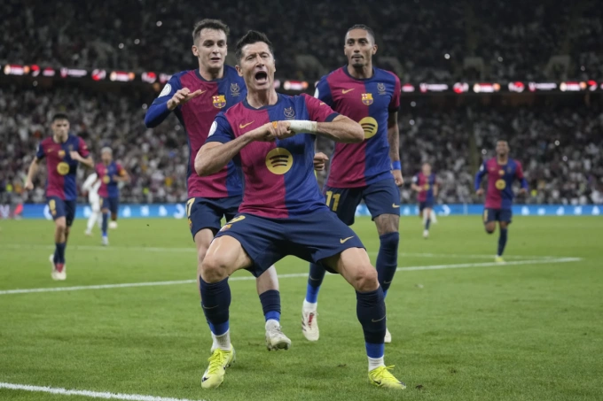 Robert Lewandowski mừng bàn trong trận Barca thắng Real 5-2 ở chung kết Siêu Cup Tây Ban Nha tại sân King Abdullah,Jeddah,Arab Saudi ngày 13/1. Ảnh: AP