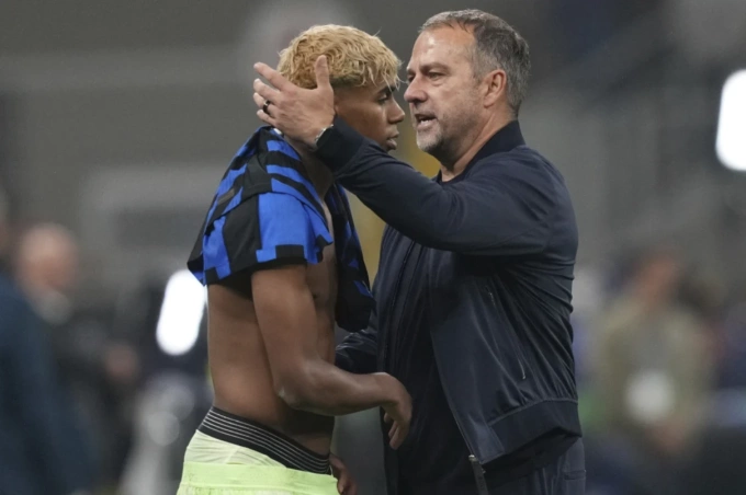 HLV Hansi Flick an ủi Lamine Yamal sau trận Barca thua Inter Milan ở lượt về bán kết Champions League ngày 6/5. Ảnh: AP