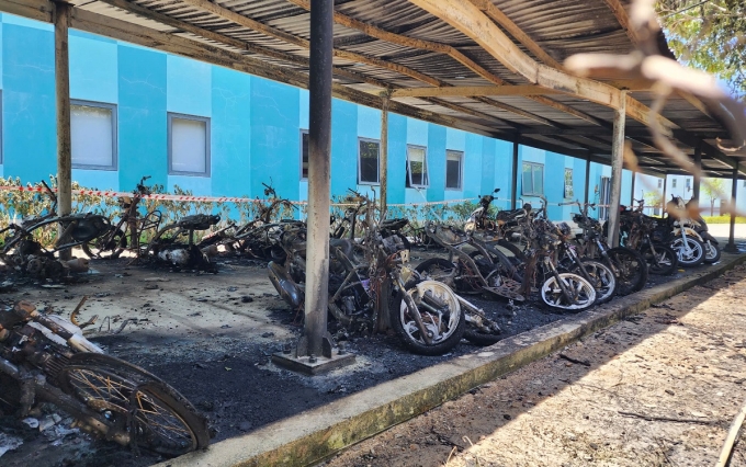 Hàng loạt xe máy,xe điện cháy trong nhà xe Trường quốc tế IEC Quảng Ngãi. Ảnh: Thạch Thảo