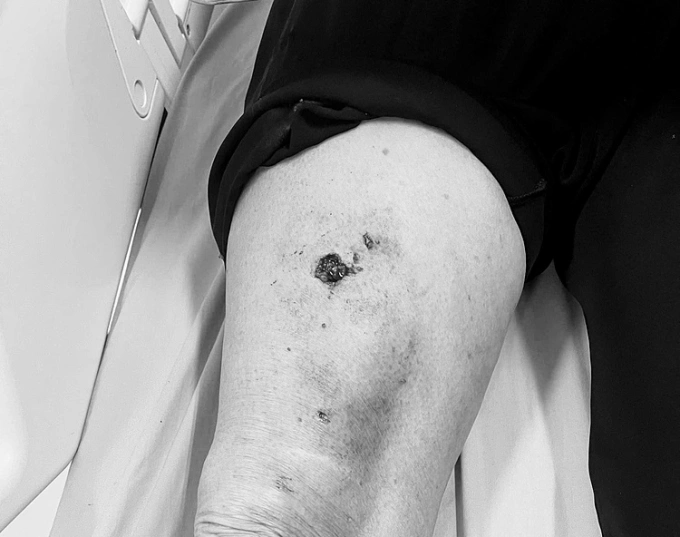 Một vết chó cắn sâu tại chân bà cụ. Ảnh: Bệnh viện cung cấp