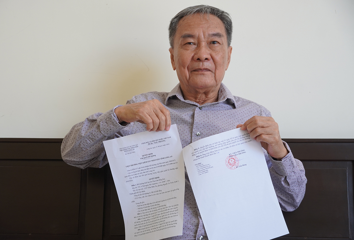 Sáng 25/6,tại trụ sở VKSND Long An,đại diện VKS hai tỉnh đã trao quyết định bồi thường thiệt hại cho ông Sơn,68 tuổi. Buổi lễ diễn ra trong vài phút.