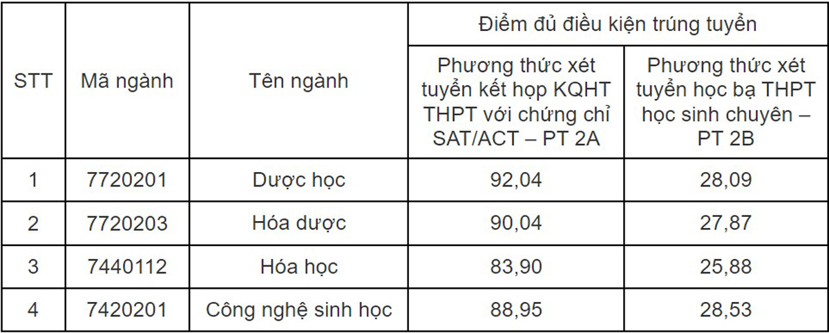 Ngoài ra,trường xét kết hợp học bạ và SAT/ACT (bài thi chuẩn hóa quốc tế) với mọi thí sinh (PT2A). Ngành Dược học dẫn đầu với 92,04/100 điểm,theo sau là Hóa dược 90,04. Hóa học vẫn lấy điểm chuẩn thấp nhất - 83,9.