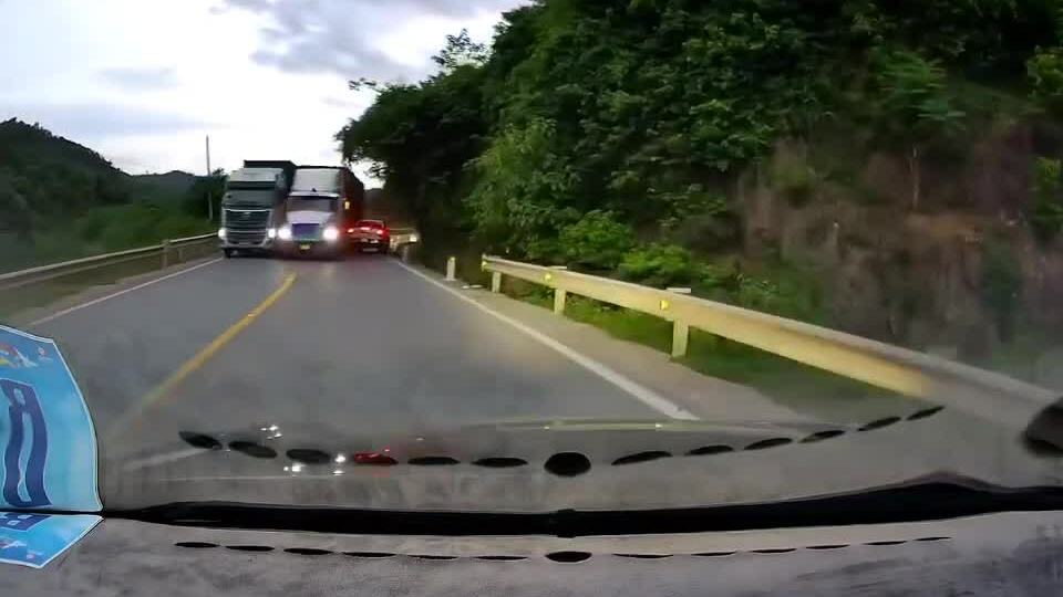 Tình huống giao thông: Lái xe container lấn làn vượt qua một chiếc xe khác lớn tương đương ở đoạn đường hẹp. Hai chiếc xe lớn chiếm gần hết mặt đường bất chấp ở hướng ngược chiều có xe đi tới. Dù đi đúng phần đường,chiếc xe bán tải bị lái xe container ép sát vào lề đường,nơi có rãnh thoát nước,buộc phải dừng lại để tránh tai nạn.