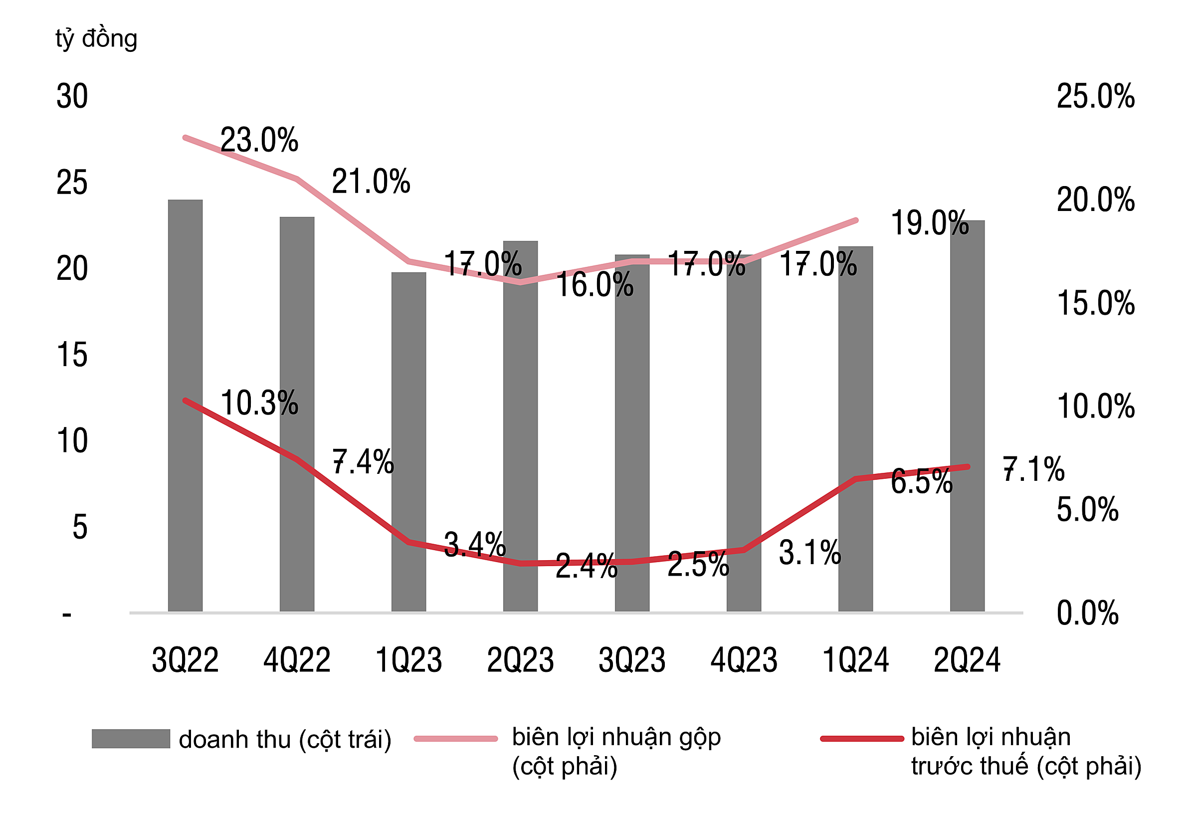 Cả doanh thu và tỷ suất lợi nhuận đều đang quay lại tiệm cận mức đỉnh hồi quý III/2022 - thời điểm trước khi tiêu dùng không thiết yếu bắt đầu suy thoái. Ông Hiểu Em tự tin rằng với bối cảnh giá cả bình ổn như hiện tại,con số trên hoàn toàn có thể duy trì. Bên cạnh đó,công ty sẽ tập trung tăng giá trị tuyệt đối lợi nhuận nhiều hơn là biên lợi nhuận.