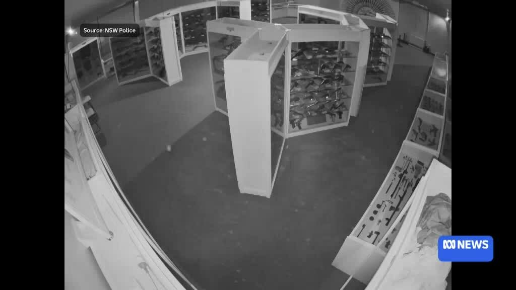 Nhóm trộm dùng búa đập vỡ các tủ kính và lấy đi 27 khẩu súng tại bảo tàng hôm 25/8. Video: Cảnh sát New South Wales