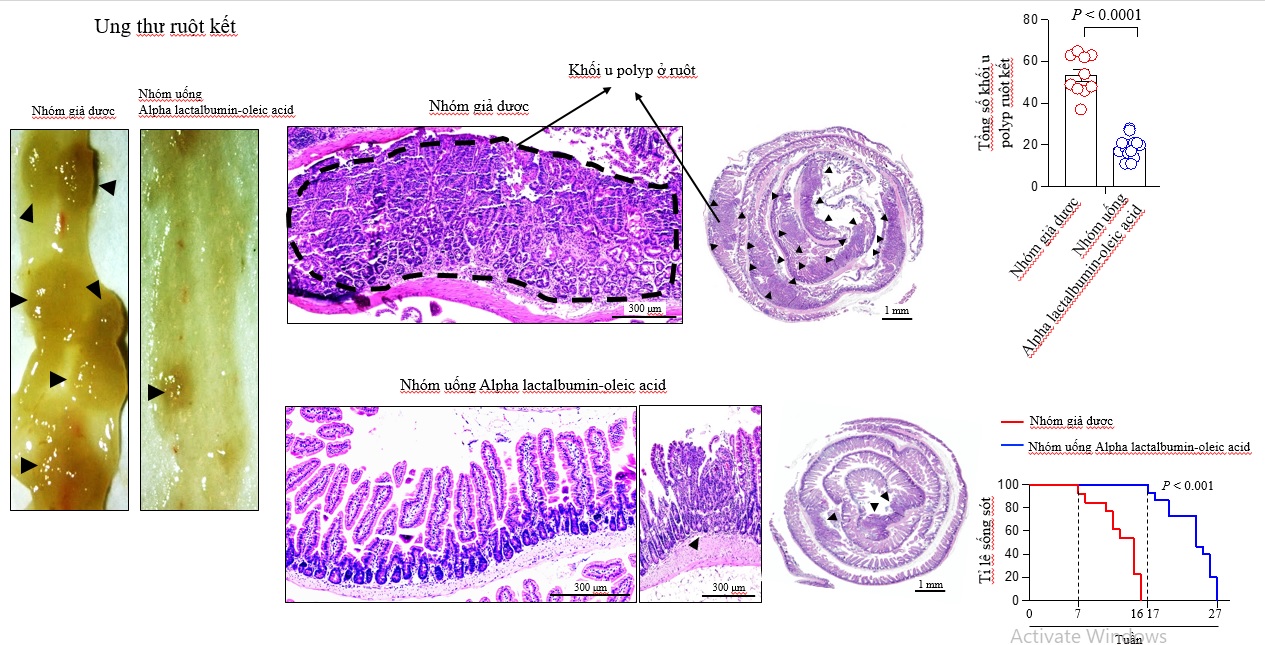 Hình ảnh ung thư ruột kết và tác dụng làm giảm khối u polyp của phức hợp alpha lactalbumin-oleic acid (Hình ảnh khối u được đánh dấu bằng mũi tên màu đen). Ảnh: Nhóm nghiên cứu