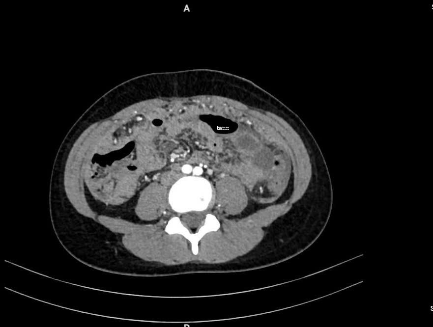 Ảnh cắt lớp vi tính (CT) cho thấy dịch chứa đầy ổ bụng (khoảng màu trắng). Ảnh: Bệnh viện Đa khoa Tâm Anh