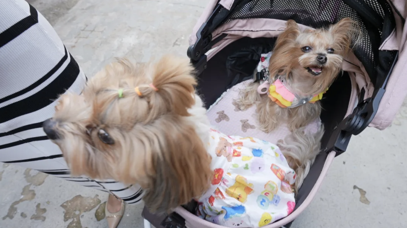 Những chú chó của Hansen và Momo được đặt trên xe đẩy để đi dạo ở Bắc Kinh. Ảnh: Justin Robertson/CNN
