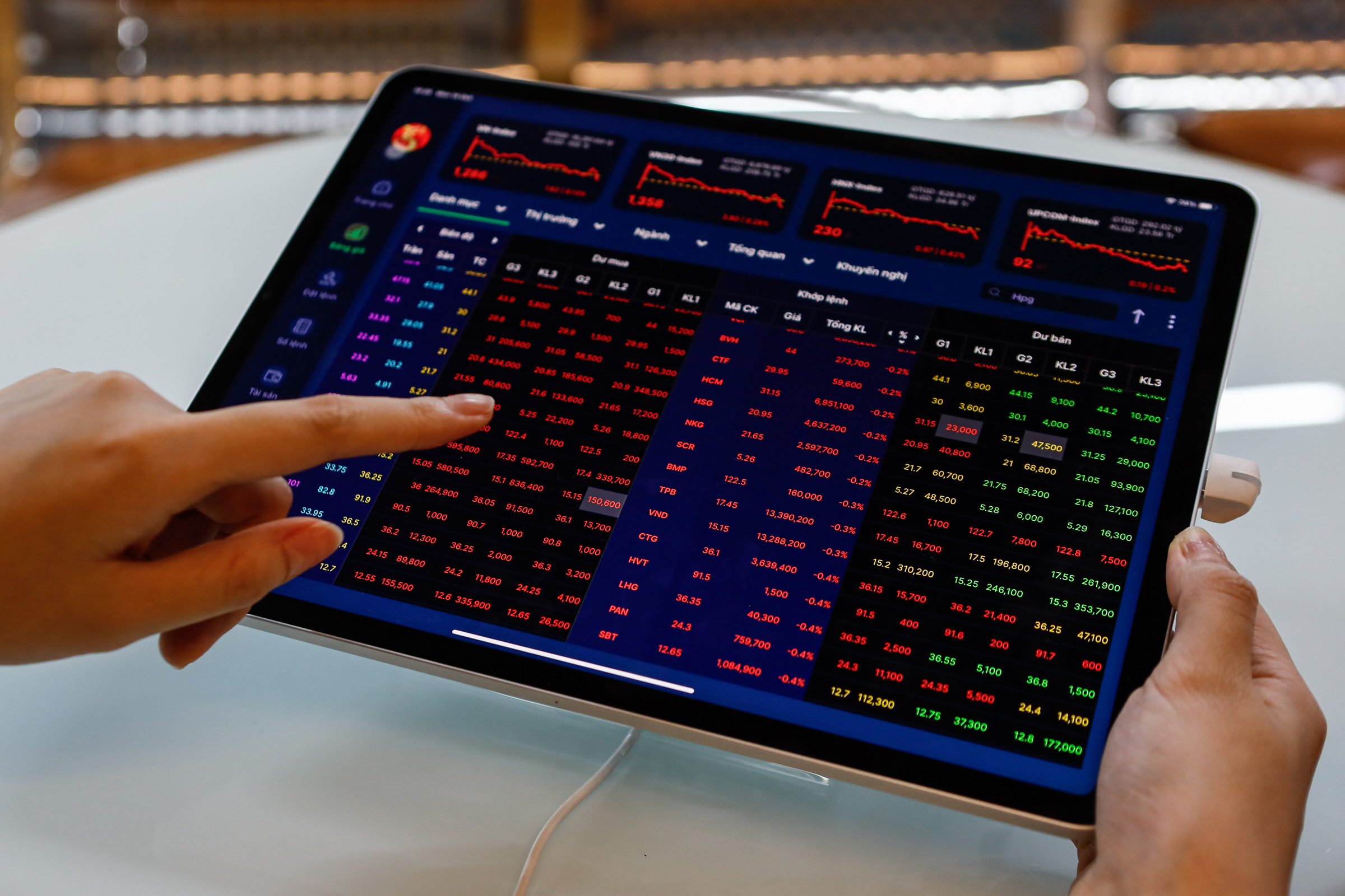 Tuy nhiên thị trường cũng ghi nhận một số bệ đỡ như BID,VPB hay MWG với mức tăng quanh 1%. Sàn HoSE còn ghi nhận 4 mã tăng trần nhưng thanh khoản nhỏ giọt,nổi bật nhất là QCG. Cổ phiếu của Quốc Cường Gia Lai đã đạt sắc tím hai phiên liên tiếp.