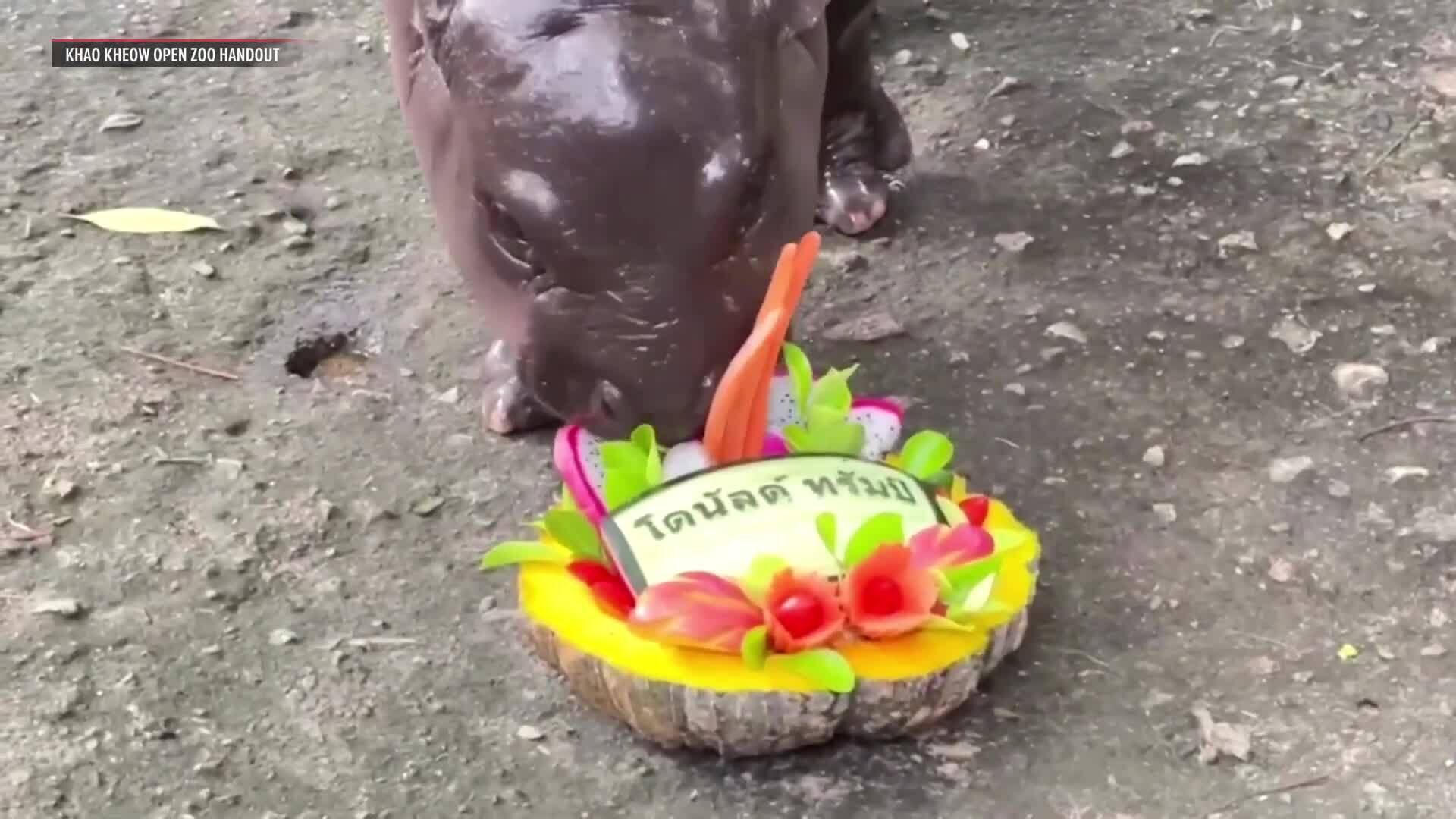 Moo Deng chọn đĩa trái cây khắc tên ông Trump trong vườn thú Khao Kheow ngày 4/11. Video: Facebook/Vườn thú Khao Kheow