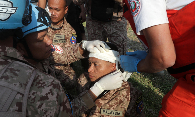Binh sĩ Malaysia thuộc UNIFIL bị thương trong vụ không kích ở thành phố Saida,Lebanon ngày 7/11. Ảnh: AFP