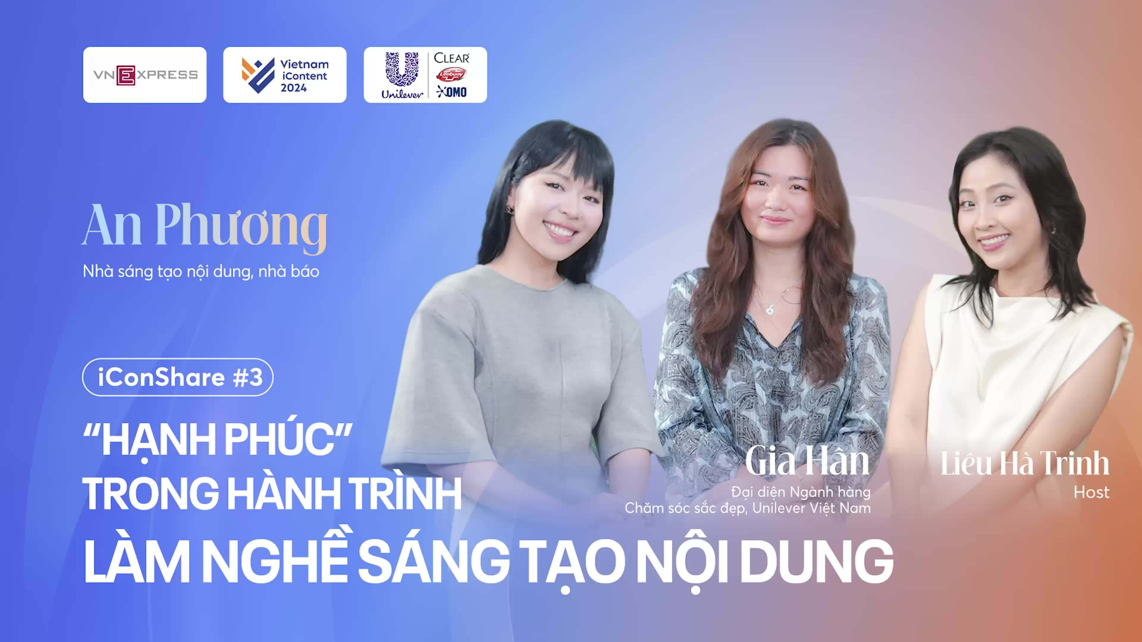 Số thứ ba của talkshow iConShare có chủ đề "Hạnh phúc trong hành trình làm nghề sáng tạo nội dung". Chương trình có sự tham gia của khách mời là chị An Phương,nhà báo,nhà sáng tạo nội dung với 8 năm kinh nghiệm trong nghề sáng tạo số; chị Lâm Gia Hân,Quản lý quan hệ công chúng và Người có tầm ảnh hưởng,ngành hàng chăm sóc sắc đẹp,Unilever Việt Nam. Người dẫn dắt xuyên suốt chương trình là MC Liêu Hà Trinh.