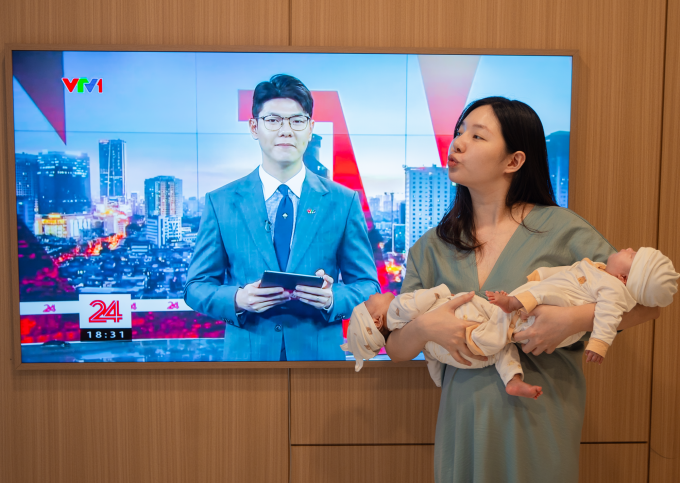 Hương Giang bế con tại nhà riêng,khi xem chương trình chồng dẫn trên VTV 24,năm 2024. Ảnh nhân vật cung cấp