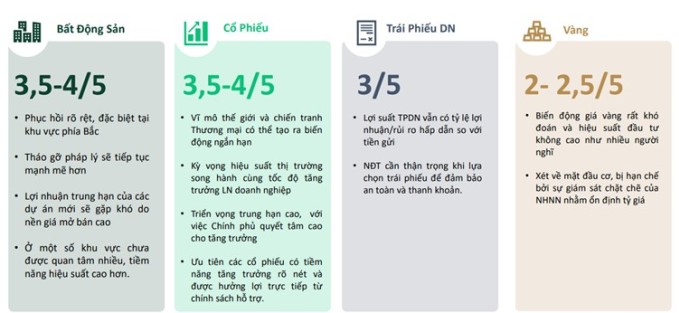 Ông đánh giá vàng ở mức 2,5/5 điểm,xem đây là kênh đầu tư trung bình với vai trò phòng thủ. Bất động sản và chứng khoán được xếp cao hơn,với mức 3,5 - 4,0 điểm,nhấn mạnh tiềm năng tăng trưởng dài hạn,đặc biệt trong bối cảnh cơ sở hạ tầng đang được đẩy mạnh. Với trái phiếu,ông đánh giá ở mức 3/5 điểm và khuyến nghị các nhà đầu tư cá nhân nên ưu tiên đầu tư qua các quỹ nhằm đảm bảo an toàn và tính thanh khoản.