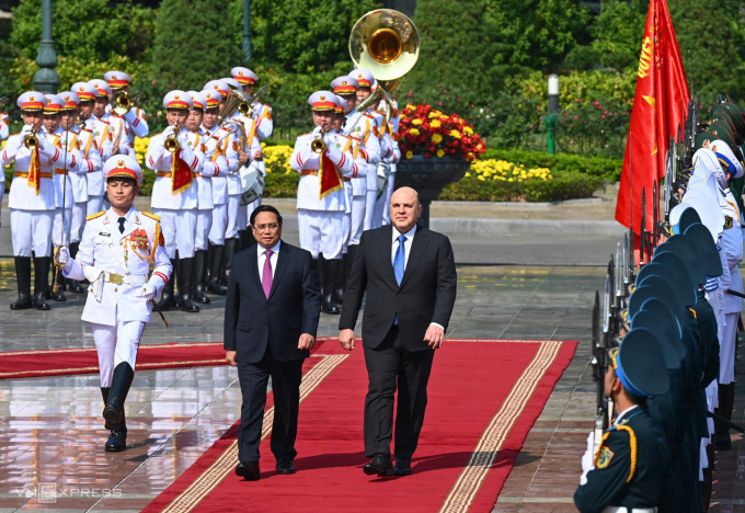 Tại lễ đón ở Phủ Chủ tịch chiều nay,Thủ tướng Phạm Minh Chính và Thủ tướng Nga Mikhail Mishustin làm lễ chào cờ và duyệt đội danh dự Quân đội Nhân dân Việt Nam.