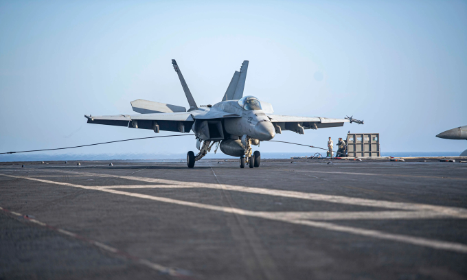 Tiêm kích hạm F/A-18E Super Hornet hạ cánh xuống tàu sân bay USS Dwight D. Eisenhower tại Biển Đỏ tháng 4/2024. Ảnh: Hải quân Mỹ