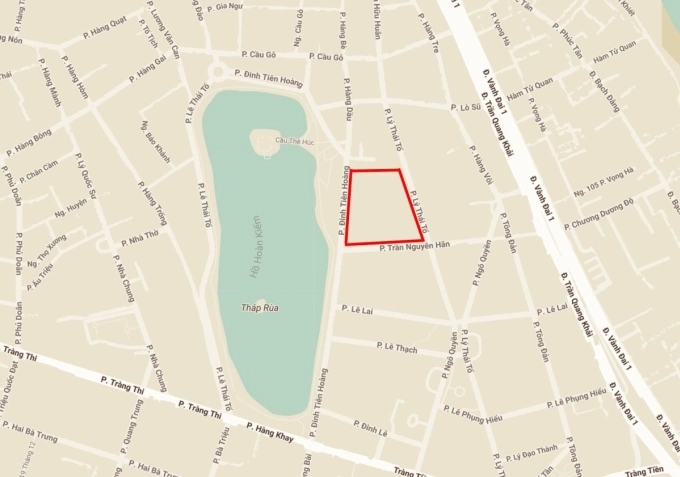 Tổng diện tích khu đất dự kiến quy hoạch khoảng 20.000 m2 (khu viền đỏ),nằm giữa các phố Đinh Tiên Hoàng,Trần Nguyên Hãn,Lý Thái Tổ và trụ sở Sở Văn hóa và Thể thao ở phố Hàng Dầu. Ảnh: Google map