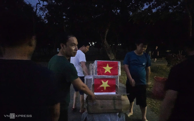 Bộ đội Việt Nam đóng gói,sắp xếp hàng hóa để tặng Myanmar từ 5h sáng. Ảnh: Song Hương