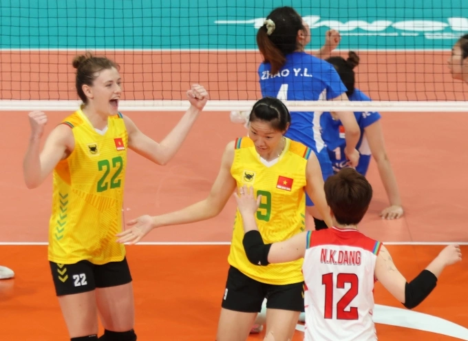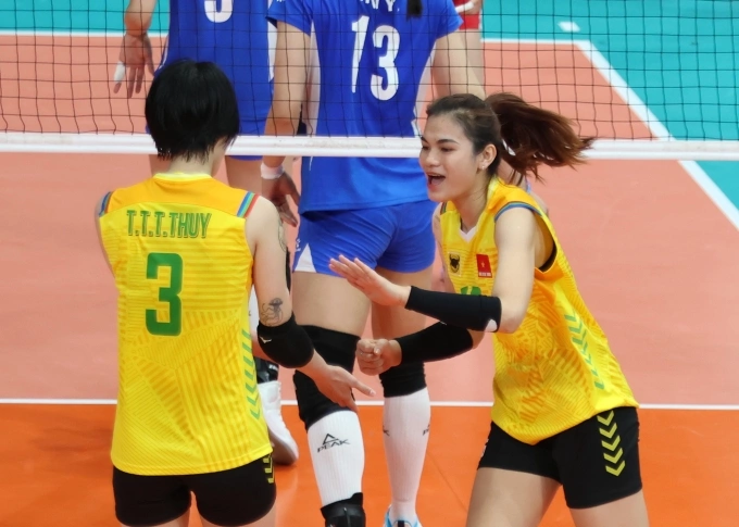 Trần Thị Thanh Thúy (trái) và Vi Thị Như Quỳnh (phải) thi đấu tại giải bóng chuyền nữ CLB châu Á 2025. Ảnh: AVC