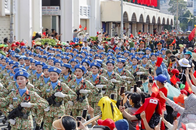 Lực lượng diễu binh lễ kỷ niệm 30/4 đi qua chợ Bến Thành trong ngày tổng duyệt. Ảnh: An Khương
