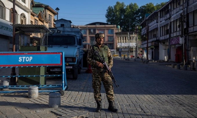 Nhân viên an ninh Ấn Độ đứng gác trên phố sau vụ tấn công vào khách du lịch gần Pahalgam ở phía nam Kashmir hôm 29/4. Ảnh: Reuters