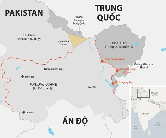 Khu vực Kashmir và ngã ba biên giới Ấn Độ - Pakistan - Trung Quốc. Đồ họa: Telegraph