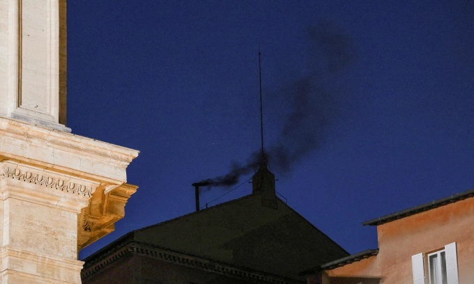 Khói đen bốc lên từ ống khói phía trên nhà nguyện Sistine ở Vatican chiều tối 7/5,khoảng hơn ba giờ sau khi Mật nghị Hồng y bầu người kế nhiệm Giáo hoàng Francis bắt đầu,lâu hơn một giờ so với Mật nghị hồi năm 2013.