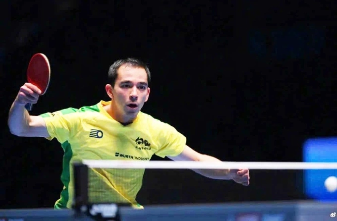 Hugo Calderano với cú trái tấn công trong trận chung kết World Cup bóng bàn tại nhà thi đấu Galaxy,khu Lộ Đãng Thành,Macau,Trung Quốc tối 20/4/2025. Ảnh: Baidu