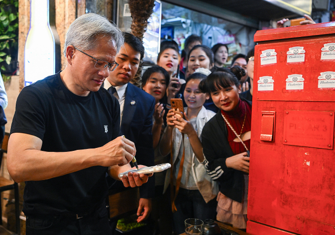 CEO tập đoàn công nghệ Nvidia Jensen Huang (áo đen) giao lưu với người dân khi đi ăn khuya tại phố tây Tạ Hiện,Hà Nội hồi tháng 12/2024. Ảnh: Giang Huy