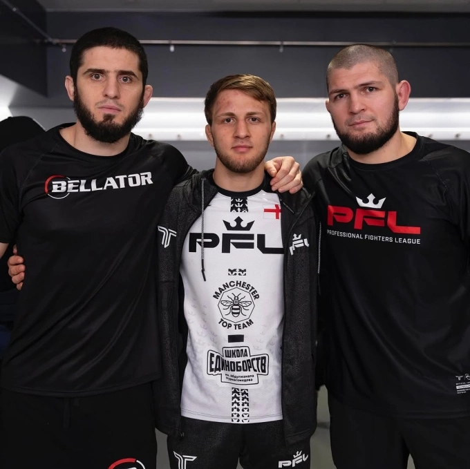 Ibragim Ibragimov (giữa) chụp ảnh cùng Islam Makhachev (trái) và Khabib Nurmagomedov trong quá trình tập luyện trước trận gặp Kenny Mokhonoana ngày 25/1/2025. Ảnh: Instgram / ibragim